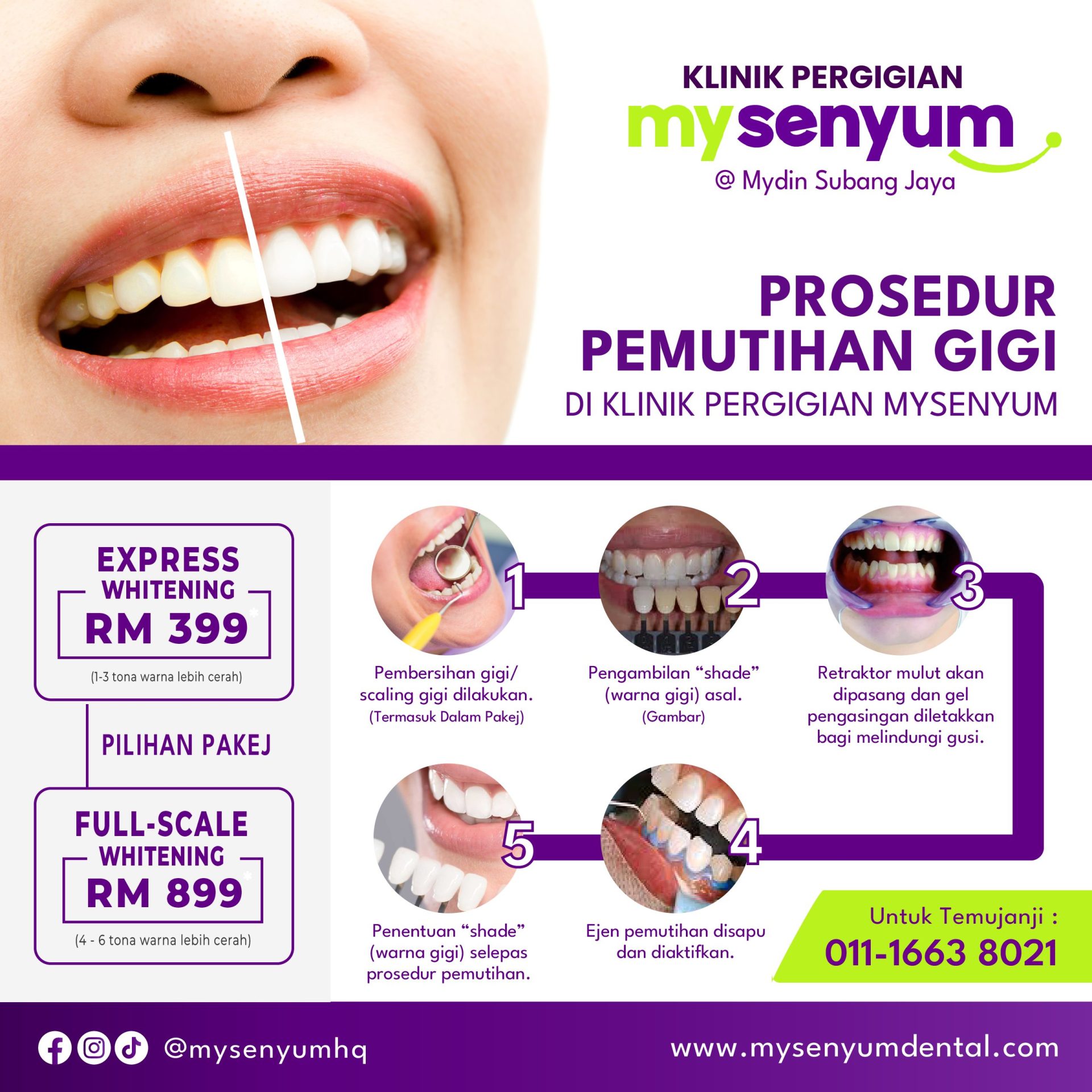 Jika anda tinggal berhampiran Subang Jaya, sila mendapatkan perkhidmatan pemutihan gigi anda di Klinik Pergigian MySenyum – Subang Jaya bagi harga yang berpatutan dan keputusan rawatan yang berkesan.